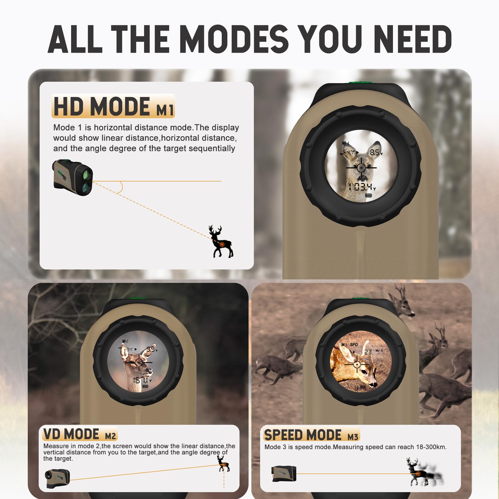 - 🏹【3 Modes】Multiple functions include linear distance,vertical height, horizontal distance, speed measuring. And featuring advanced ARC (Angle Range Compensation) technology, angle range compensation accounts for terrain angle, giving you true distance to target on uphill and downhill shots, empower you to make informed decisions, maximize your hunting experience. You can choose from three different modes: M1(Horizontal Distance + Angle Mode), M2(Vertical Height + Angle Mode), and M3(Speed Mode)